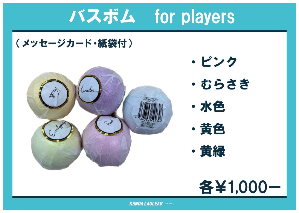 当日直接選手へお渡しできるものは、バスボムのみとなっております。