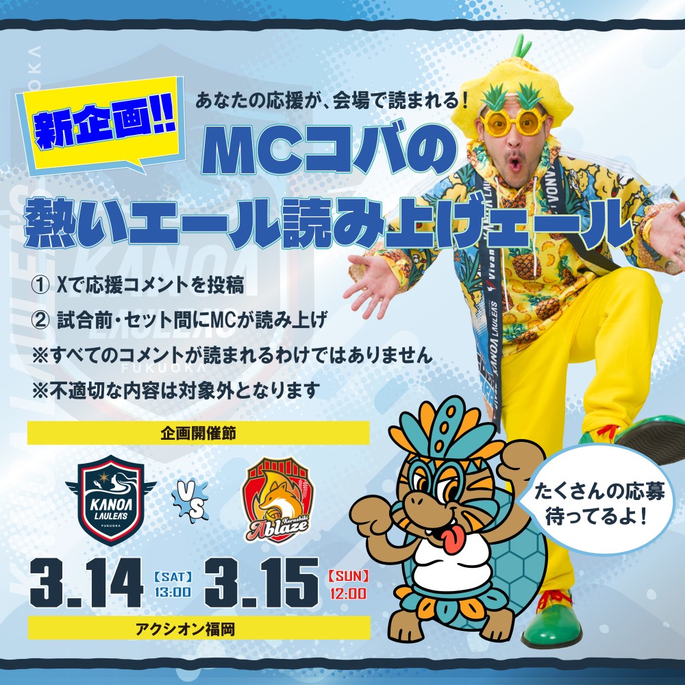 MCコバが試合前およびセット間に会場内で読み上げ、選手たちへエールを届けます。