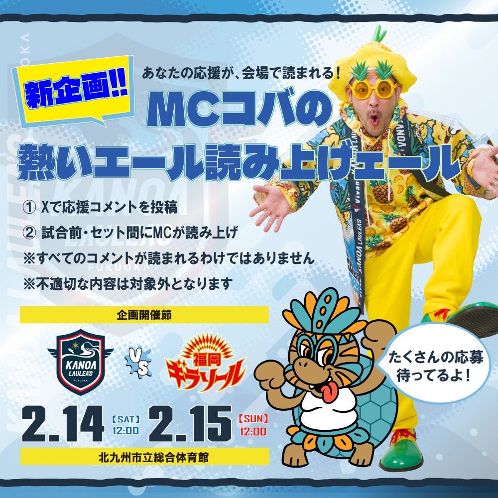 MCコバが試合前およびセット間に会場内で読み上げ、選手たちへエールを届けます。