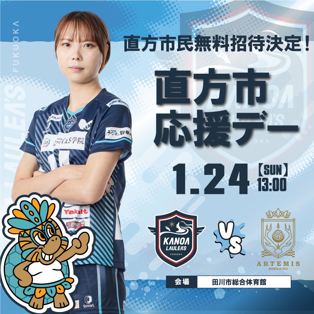 カノアラウレアーズ福岡では、1月24日(土)に開催する2025-26 V.LEAGUE WOMAN第9節 アルテミス北海道戦に関して、「直方市応援デー」を下記の通り開催します。