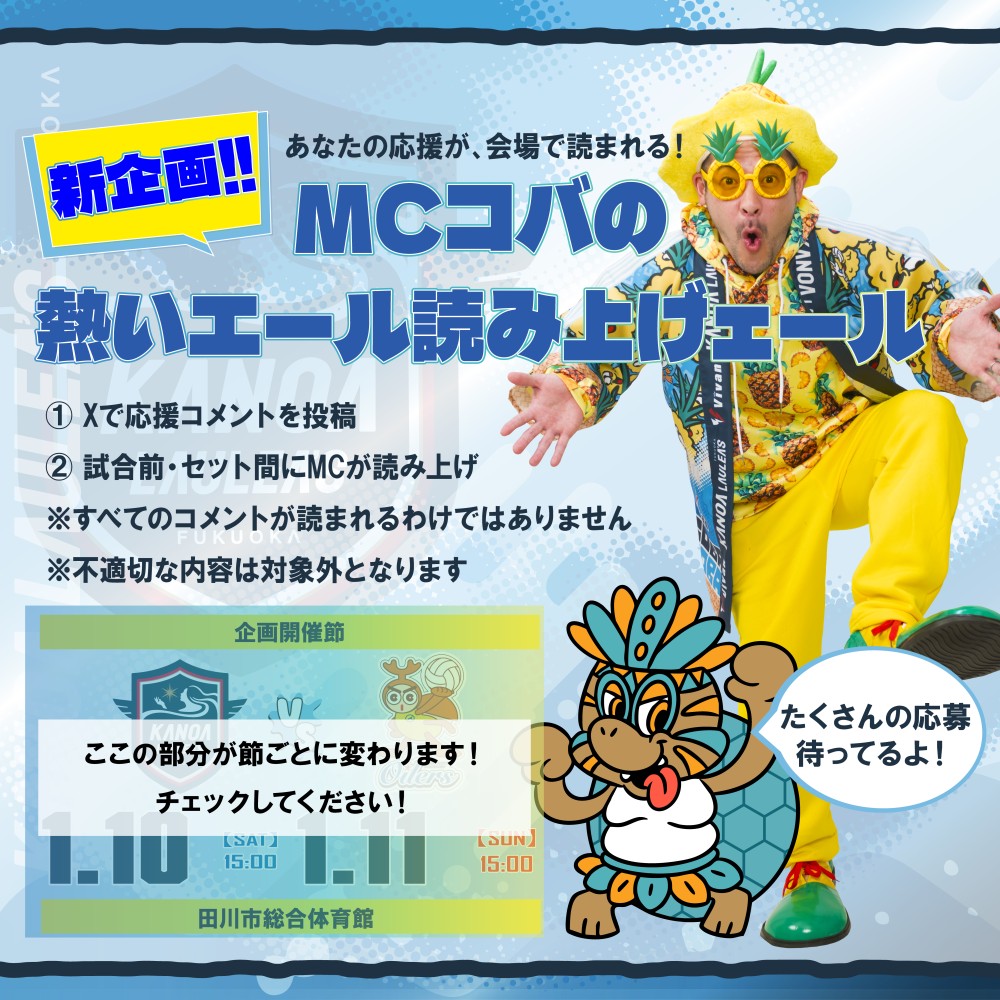 MCコバが試合前およびセット間に会場内で読み上げ、選手たちへエールを届けます。