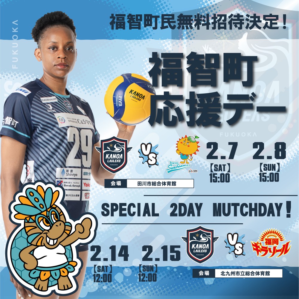 カノアラウレアーズ福岡では、2月7.8日に開催する2025-26 V.LEAGUE WOMAN第10節東京サンビームズ戦、そして2月14.15日第11節福岡ギラソール戦に関して、「福智町応援デー」を下記の通り開催します。
