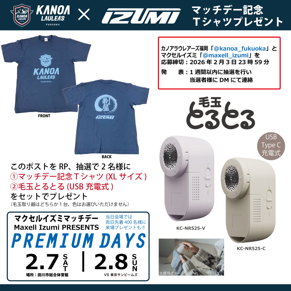 カノアラウレアーズ福岡では、2月7日(土)8日(日)に開催する2025-26 V.LEAGUE WOMAN第10節 東京サンビームズ戦に関して、「マクセルイズミマッチデー」を下記の通り開催します。
