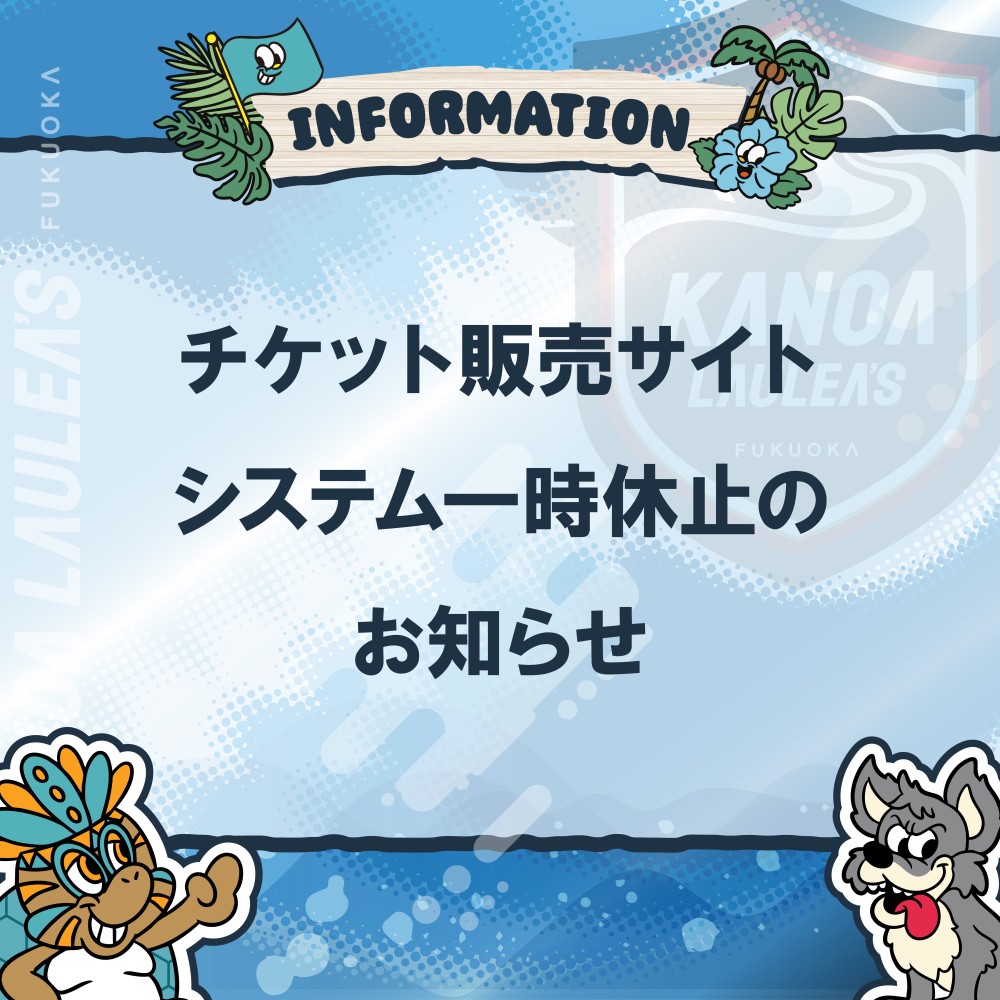 チゲットサイトにて販売しております、カノアラウレアーズ福岡ホームゲームのチケットにつきまして、システムメンテナンスの実施に伴い、下記の時間帯はチケット販売を一時休止させていただきます。
